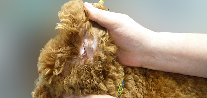 ● 耳介部の脱毛、カサブタ、ひっかき傷、炎症性の発赤がないかどうか調べます。